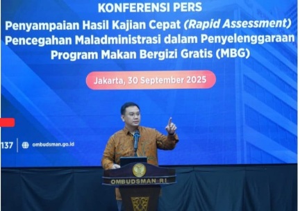 WartaSugesti.com // Jakarta – Ombudsman Republik Indonesia menemukan empat potensi maladministrasi dalam penyelenggaraan program Makan Bergizi Gratis (MBG), yakni penundaan berlarut, diskriminasi, ketidakmampuan (tidak kompeten), serta penyimpangan prosedur. Temuan tersebut disampaikan Anggota Ombudsman RI, Yeka Hendra Fatika, dalam paparan hasil kajian cepat (Rapid Assessment) di Kantor Ombudsman RI, Jakarta Selatan, Selasa (30/9/2025).